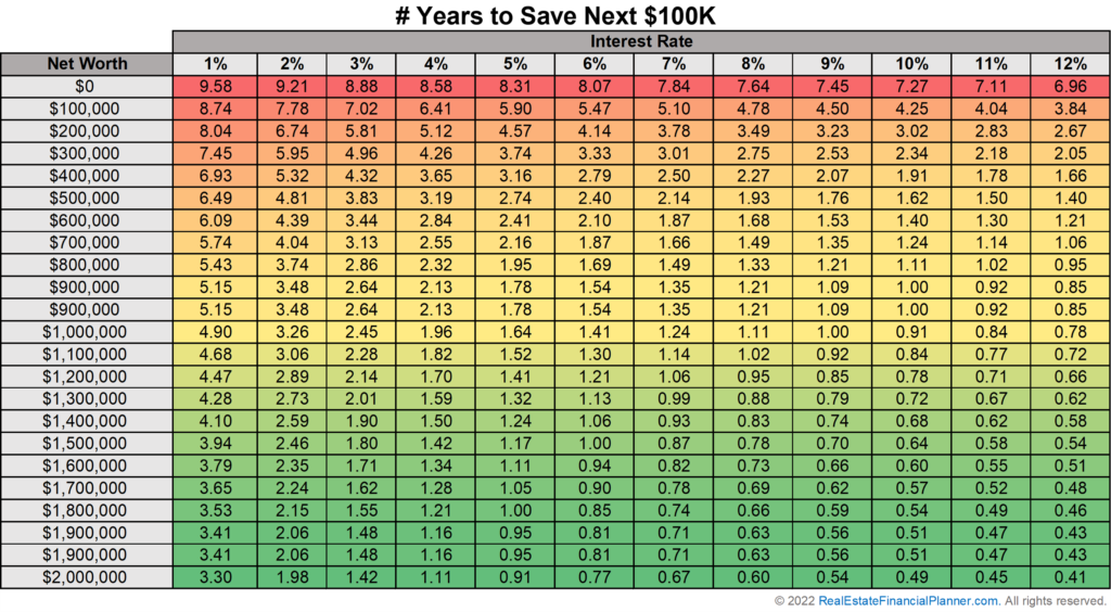 Your rate of return determines how long it takes to save each $100K on your journey to $2 million.